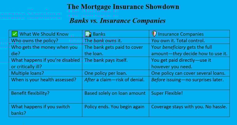 When you buy a home, mortgage insurance often comes into play—but here’s the real question: are you protecting your loved ones, or just protecting the bank? Many homeowners don’t realize that there’s a big difference between getting mortgage insurance through your bank and getting it from a licensed insurance company. One gives you control, flexibility, and real financial protection; the other might just be another way to keep your money locked into the system. In this blog, we’ll break it all down—point by point—so you can make a smarter, more empowered decision about protecting what matters most.
